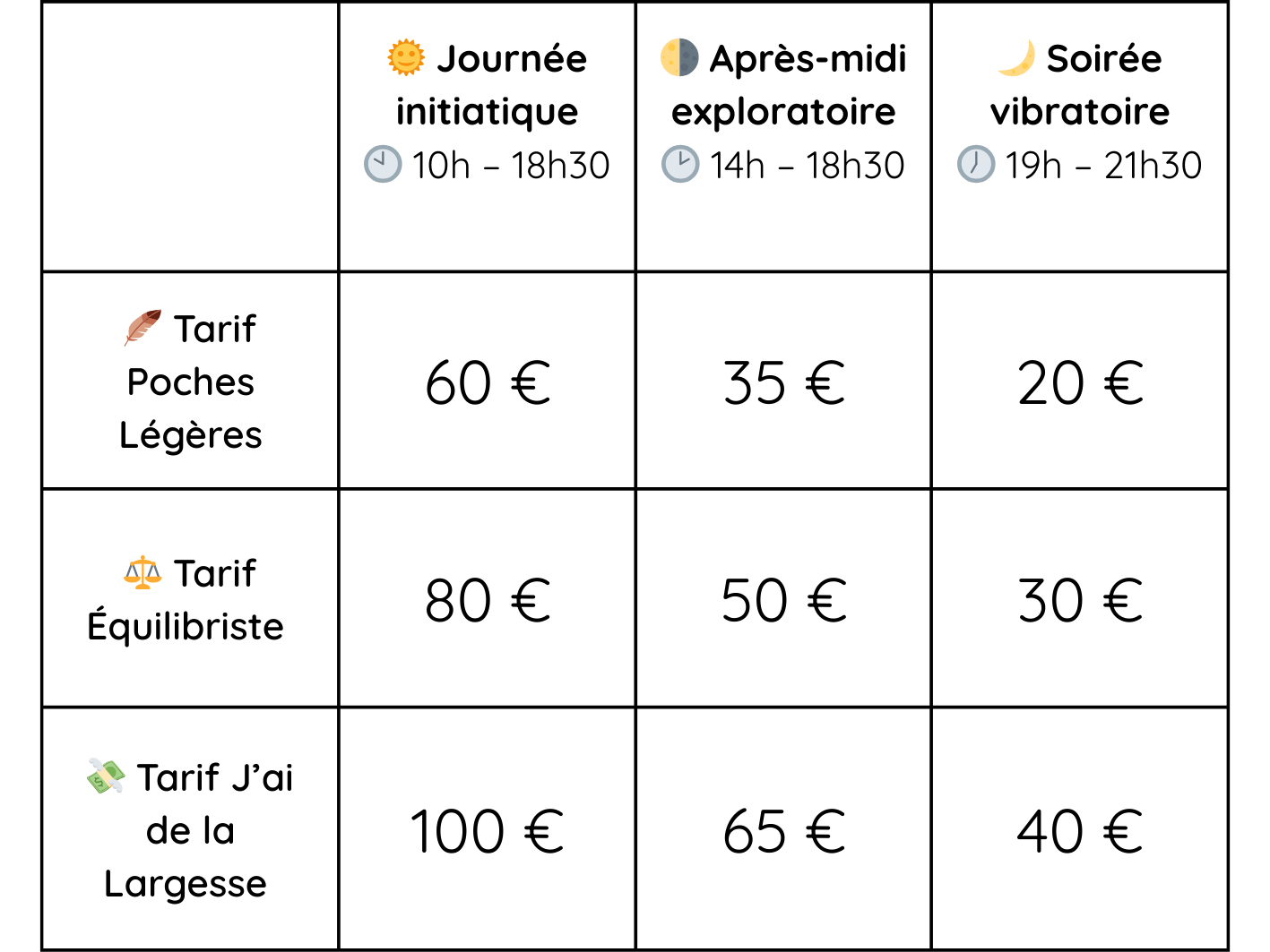 Tu choisis le tarif qui te ressemble aujourd’hui, en conscience et en simplicité.